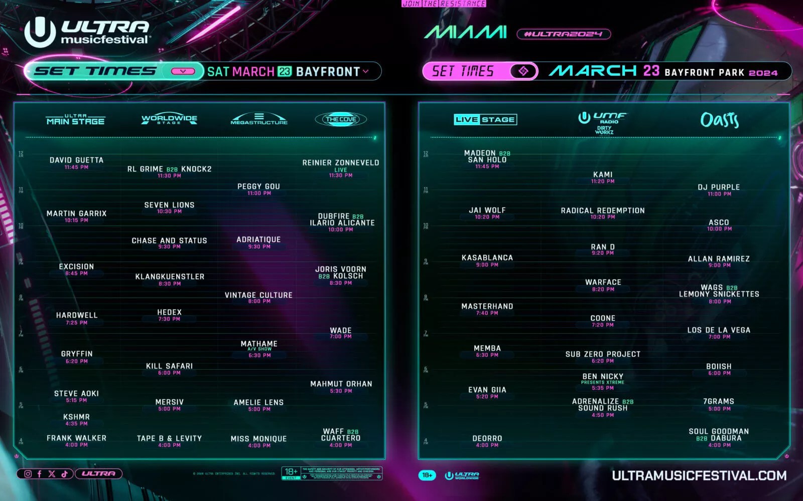 Ultra released all the set times earlier this week, breaking things down across the seven stages: Ultra Main Stage, Worldwide Stage, Megastructure, the Cove, Live Stage, UMF Radio, and Oasis. A few notable takeaways are that Carl Cox will not make an appearance this year and that there’s no A State of Trance takeover despite van Buuren being on the lineup.