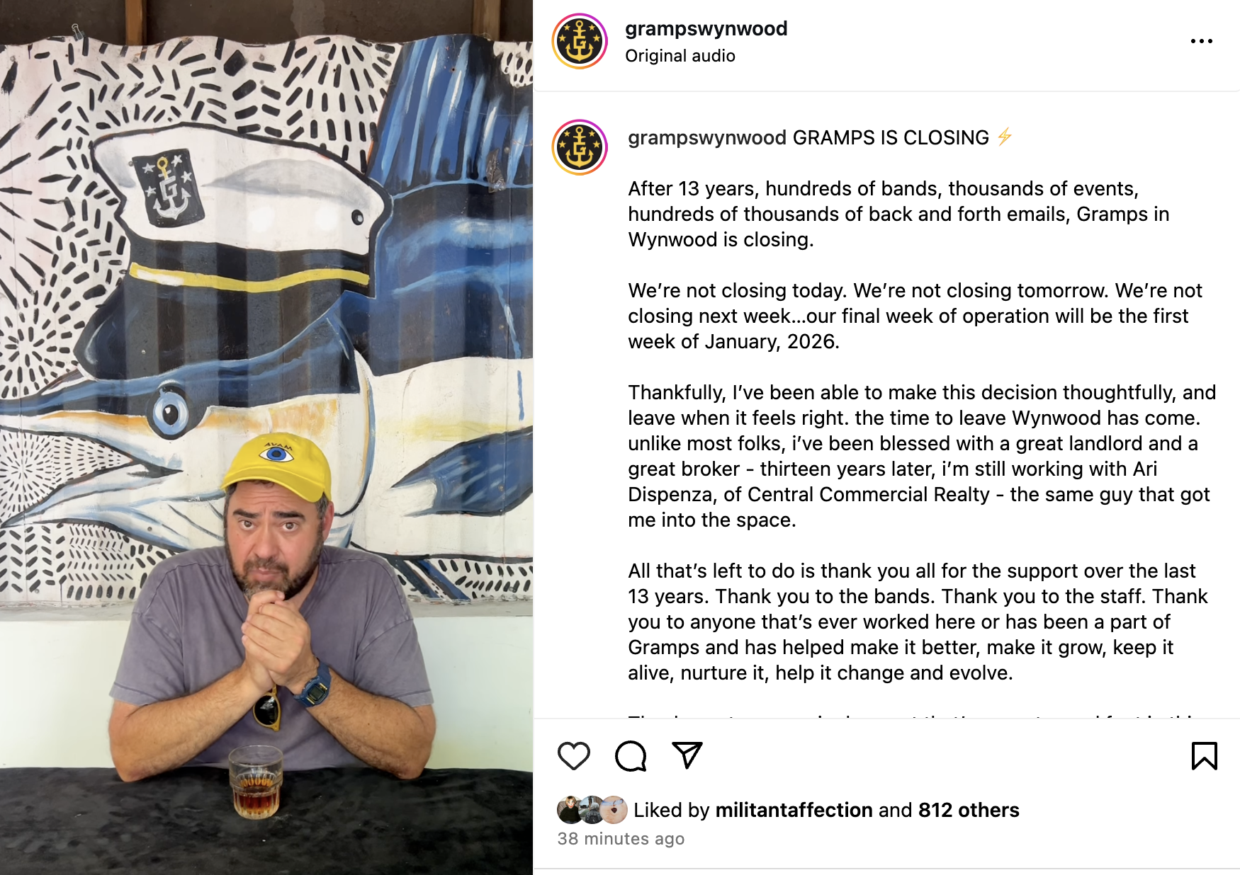 The post racked up over 800 likes and 200 comments in less than 14 minutes, with longtime fans writing, “Wynwood has definitely lost its soul once Gramps is gone,” and “No, because why would I ever step foot in Wynwood if you guys aren’t there?”