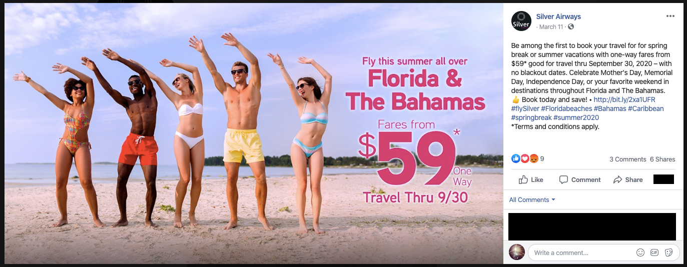 “Be among the first to book your travel for for [sic] spring break or summer vacations… Book today and save!” the airline posted alongside a photo of attractive 20-somethings swaying blissfully on a beach, unaffected by the global pandemic.