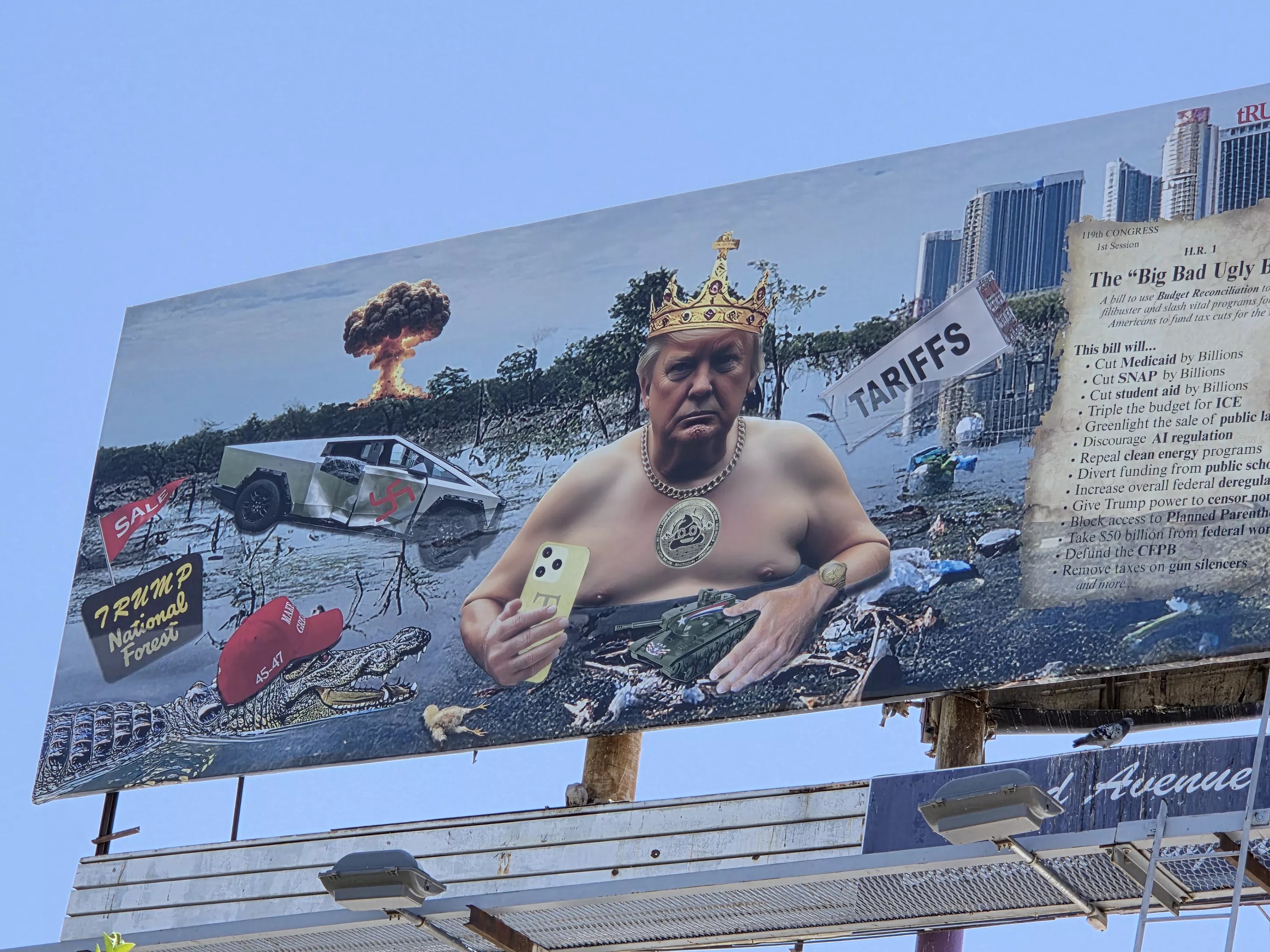 In her new project, “Swamp King,” artist Karen Fiorito depicts Trump as a towering figure in a filthy swamp, crowned in gold, draped in a “shitcoin” necklace marked by a poop emoji, and clutching a Trump Mobile phone. The billboard references Trump’s policies during his second presidency so far, from his tariffs to the “Big Beautiful Bill,” to encapsulate the chaos of his administration.