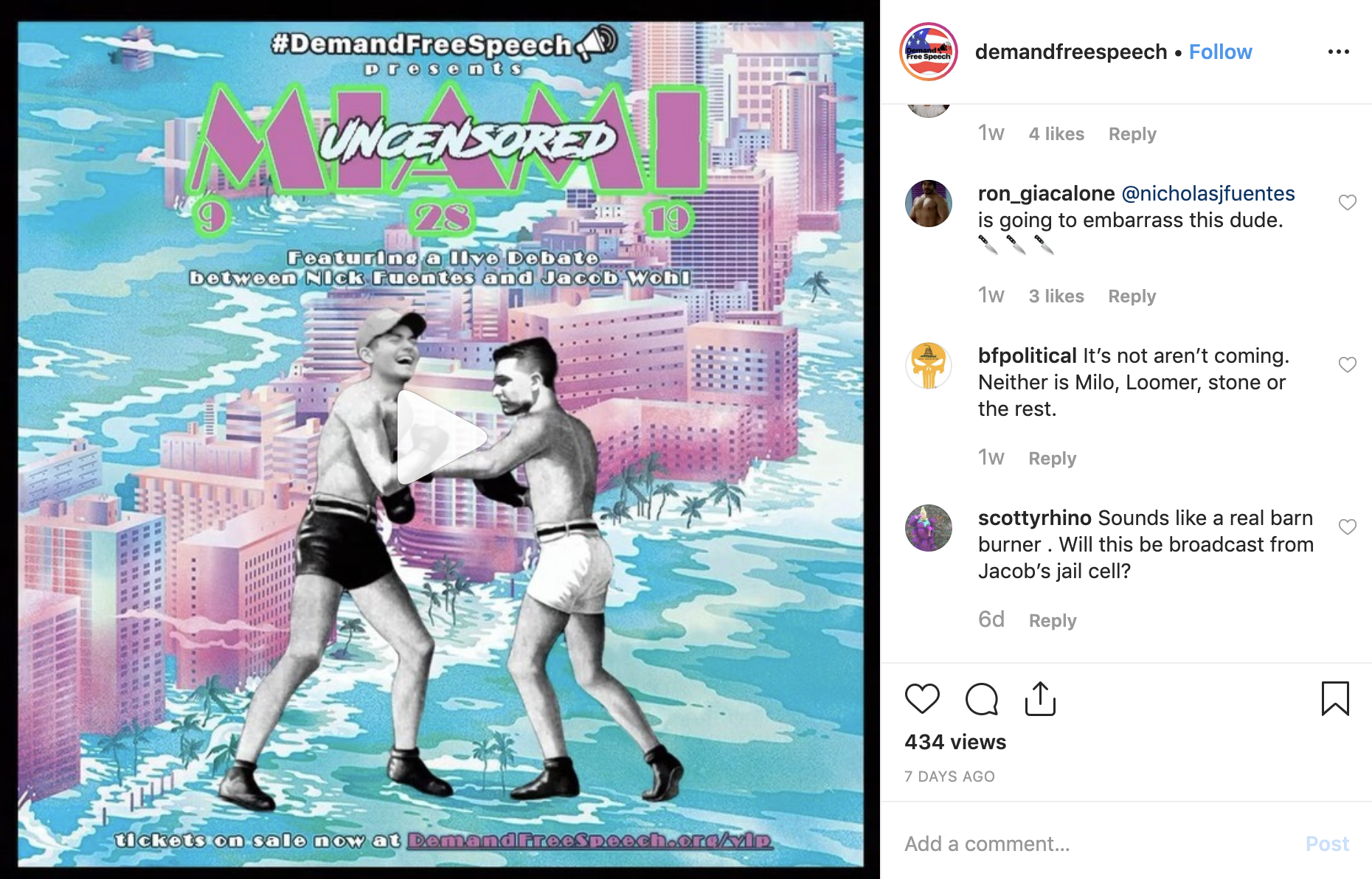 The event’s top billing? Serial con artist Jacob Wohl, who is charged in California with a felony for unlawfully selling investments in a company called Montgomery Assets, will apparently debate Nick Fuentes, a self-described “American nationalist” who has appeared on white-nationalist programs and at one point was recorded going on an anti-Semitic rant about a fellow conservative blogger by calling him a “race traitor” and saying he “worked for Jews.” It’s unclear what Wohl and Fuentes might actually debate, but the event seems designed more to generate protests and controversy than to conduct intellectual discussions.