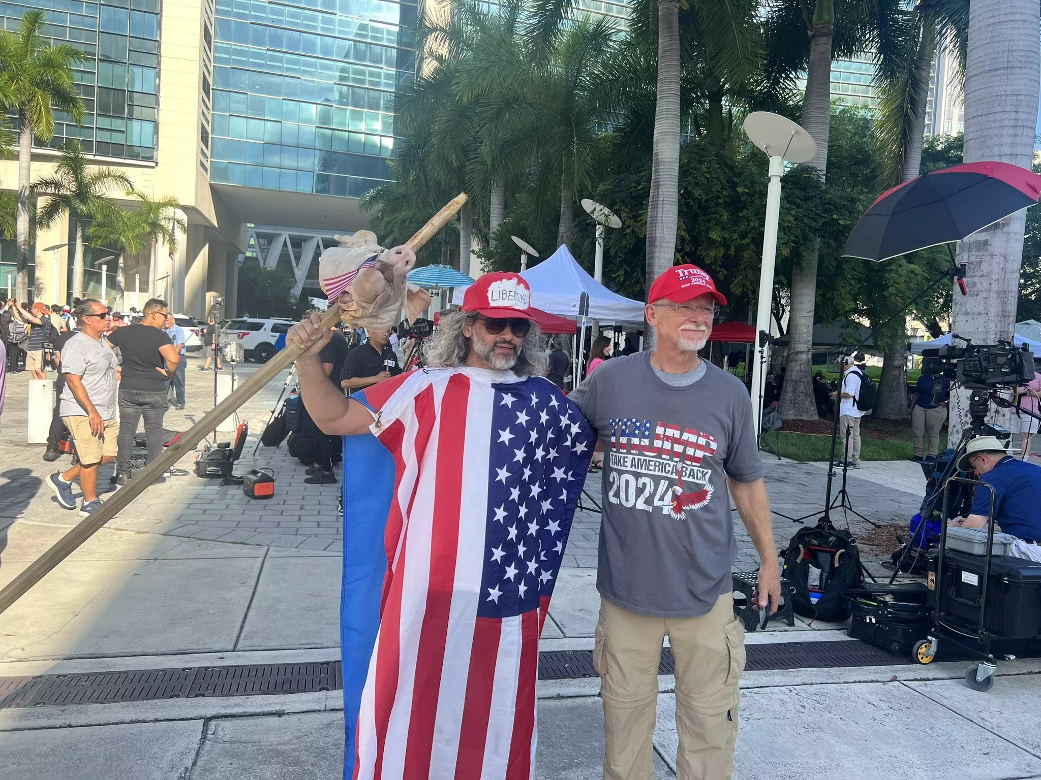 Before noon, tensions mounted between Trump supporters and anti-Trump demonstrators as the opposing groups began shouting at each other. Domenic Santana, the man dressed in a black-and-white jail outfit and holding a “Lock him up” sign, was flanked by Miami police, who attempted to create a barrier between him and a pro-Trump crowd that had surrounded him.