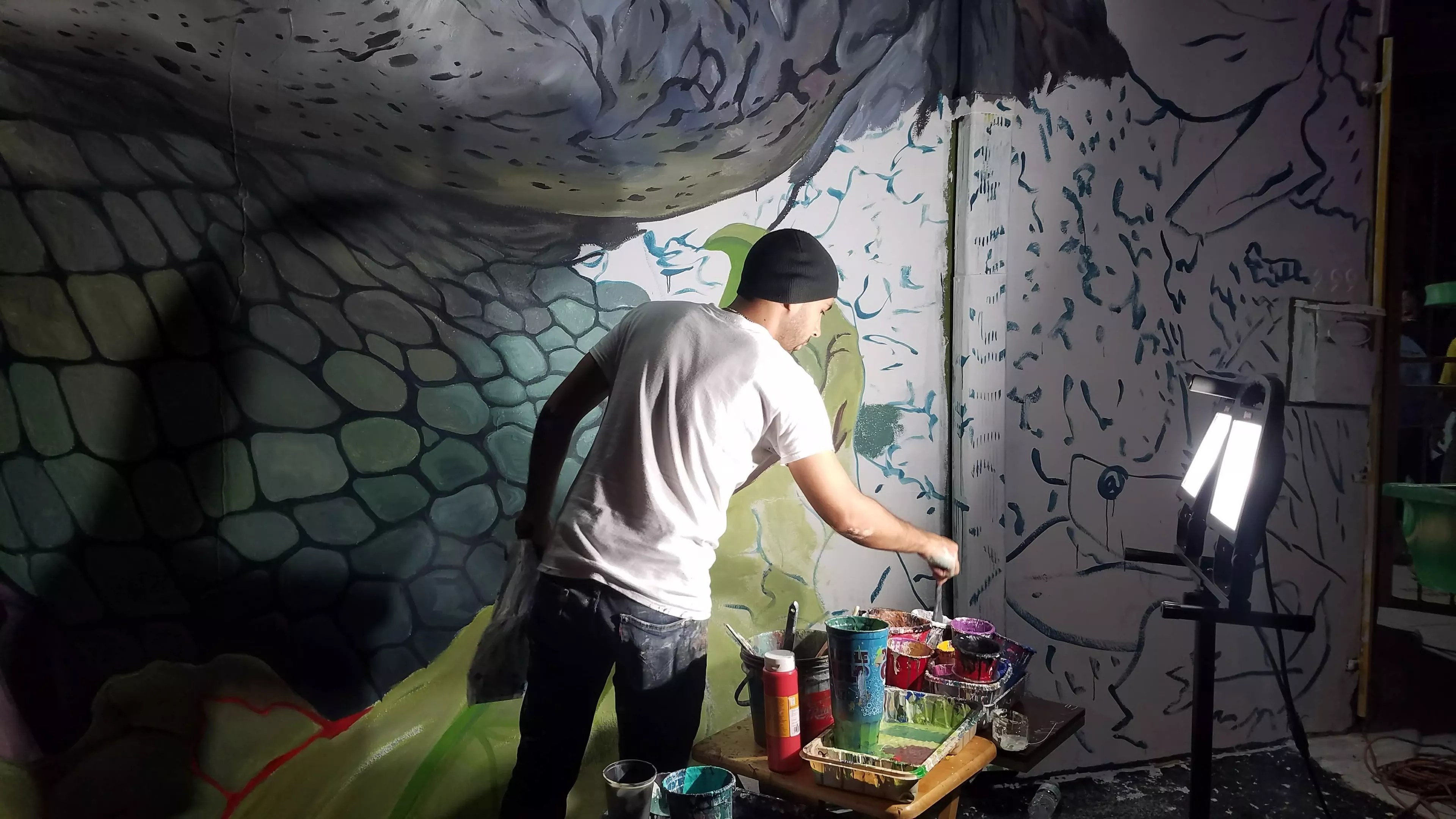 Though the AR-mapping process is difficult, for Gamboa, the most challenging part of creating the mural was painting the Burmese python. “The references I was using were not very good, so I had to make up some, and by the time I did the head of the snake, I felt like I was losing my mind,” Gamboa tells New Times.