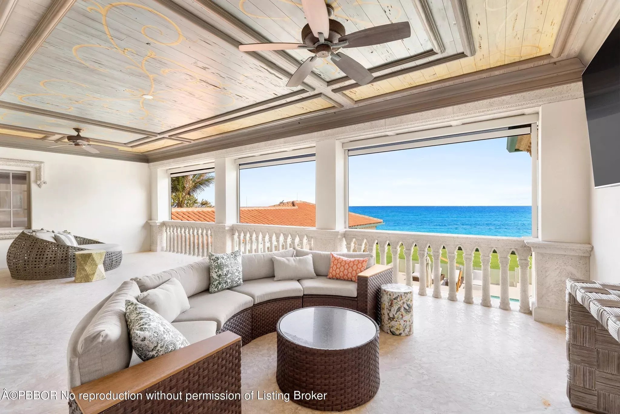 Covered outdoor balcony with seating, offering stunning views of the Atlantic Ocean