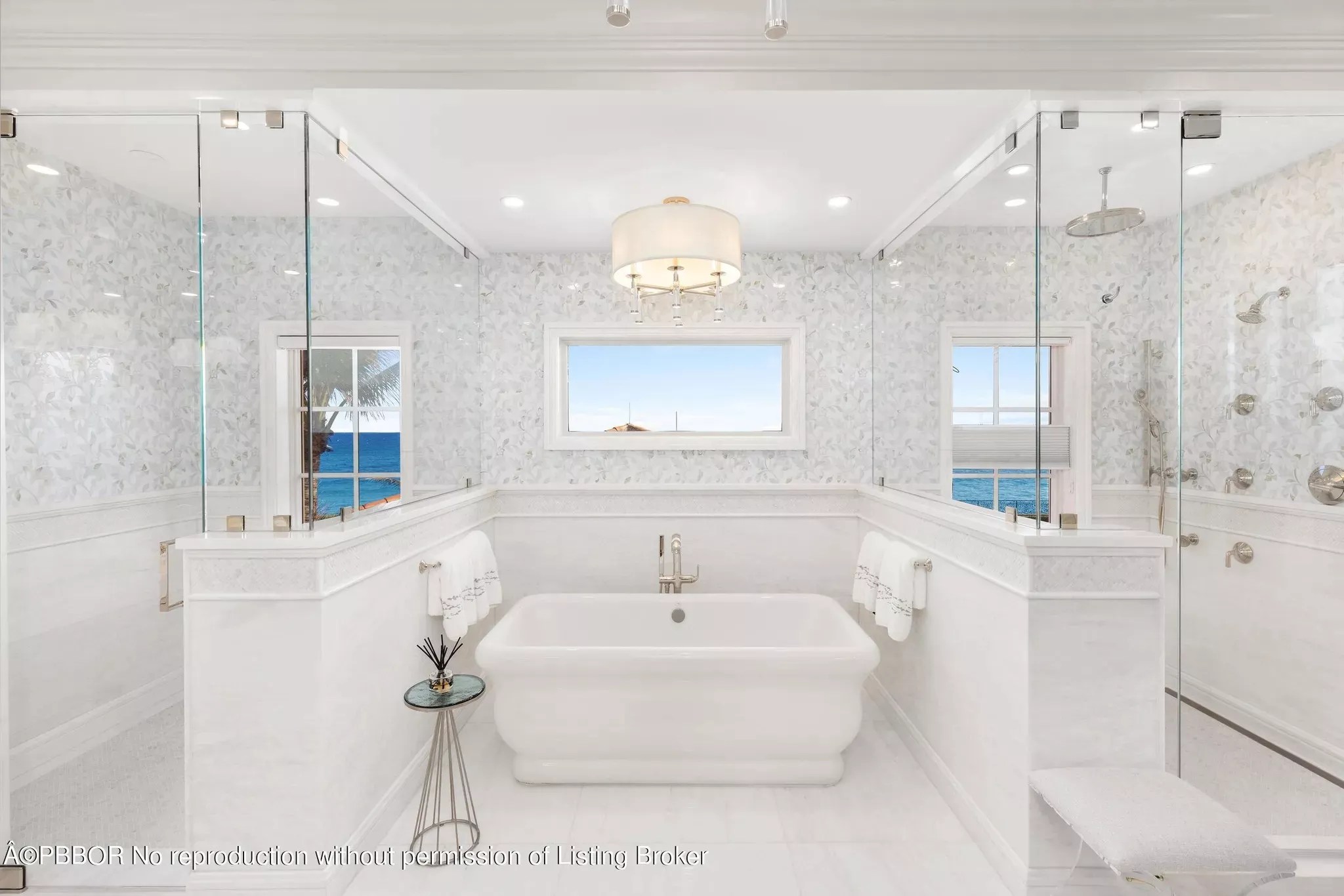 A soaking tub with a view — this bathroom offers tranquility with floor-to-ceiling oceanfront windows.