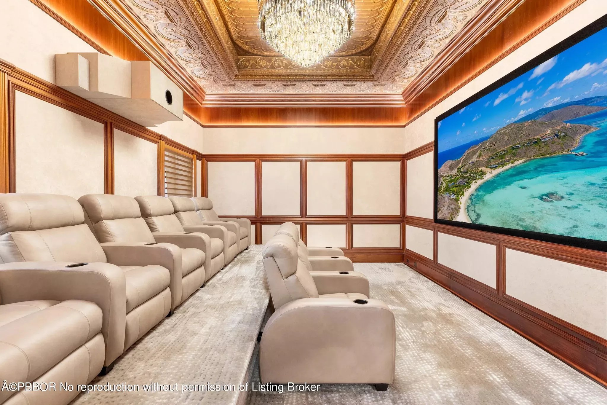 The in-home theater features recliners and a large screen for a cinematic experience.
