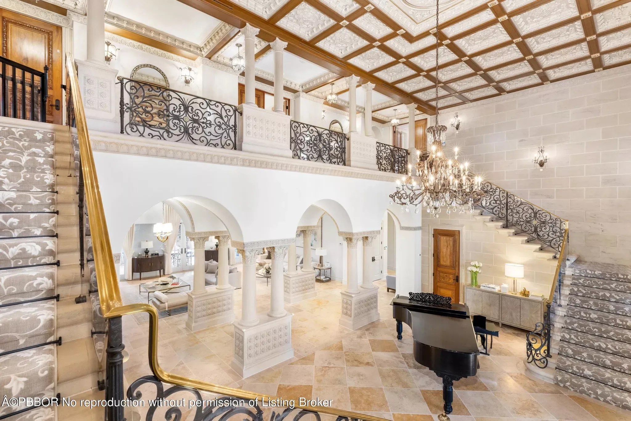 The estate’s grand foyer is complete with a sweeping staircase, chandelier, and ivory keys suited for the “Piano Man.”