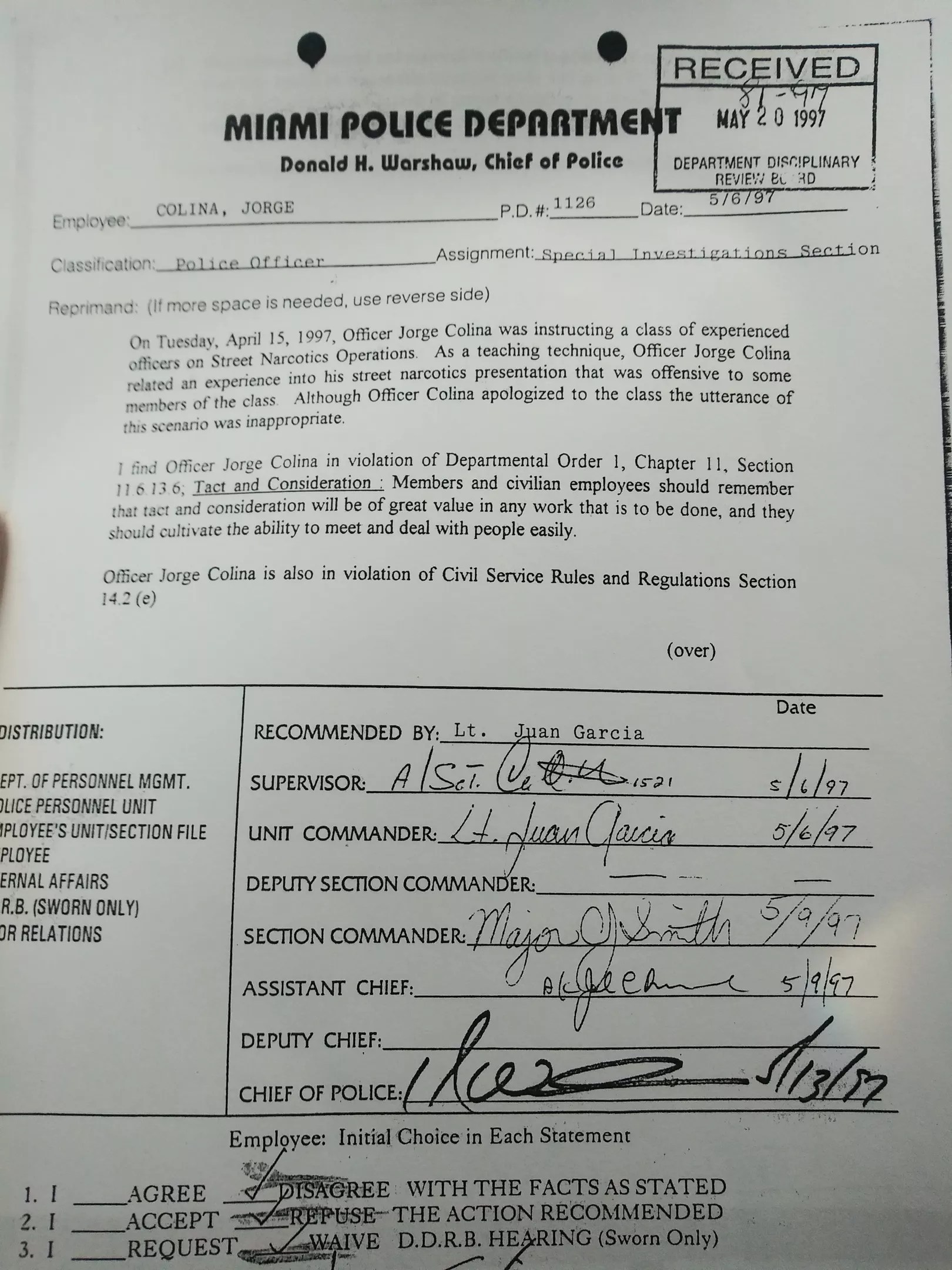 The reprimand concludes that Colina violated departmental policies on tact and consideration. A 1997 reprimand placed in Jorge Colina’s file. Photo by Miami Community Police Benevolent Association