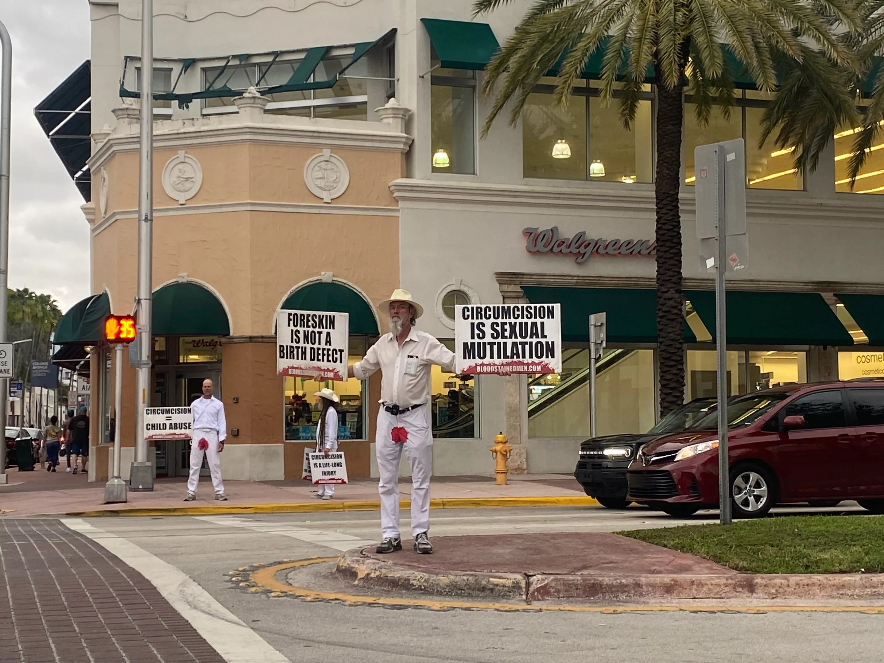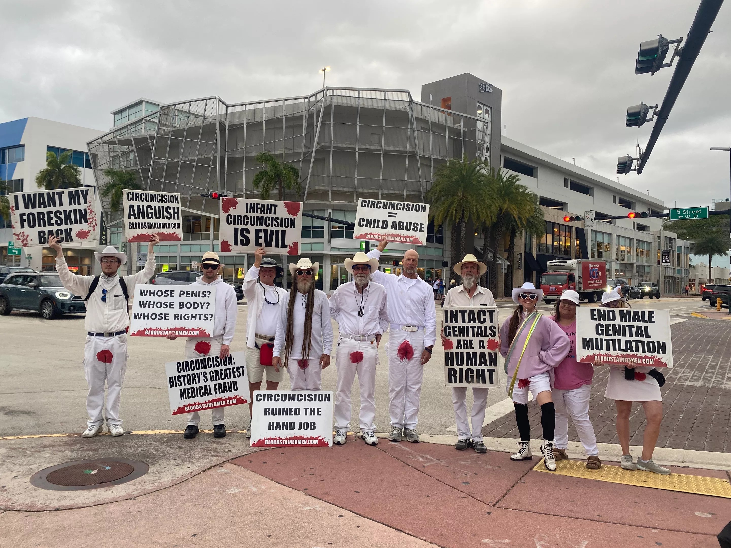 Atkinson is president of Bloodstained Men, a nonprofit that seeks to give “victims of genital cutting a voice” and to educate Americans about the harms of infant circumcision and the anatomical importance of the foreskin. On this last Friday afternoon in January, he’s one of seven circumcised men dressed in the group’s signature all-white getup with identical trouser stains commanding the intersection at Collins Avenue and Fifth Street in Miami Beach. For more than an hour, they hold up signs and banners and distribute pamphlets and bumper stickers with slogans like “Circumcision ruined the hand job.” Most passersby avert their eyes to avoid falling prey to a spiel. But some drivers honk in solidarity, and one gentleman rolls down his window to raise a fist in support of the movement. A gregarious and inebriated gaggle of Brits cheers, shouting “Fucking barbaric!” and Only in America, mate!”
