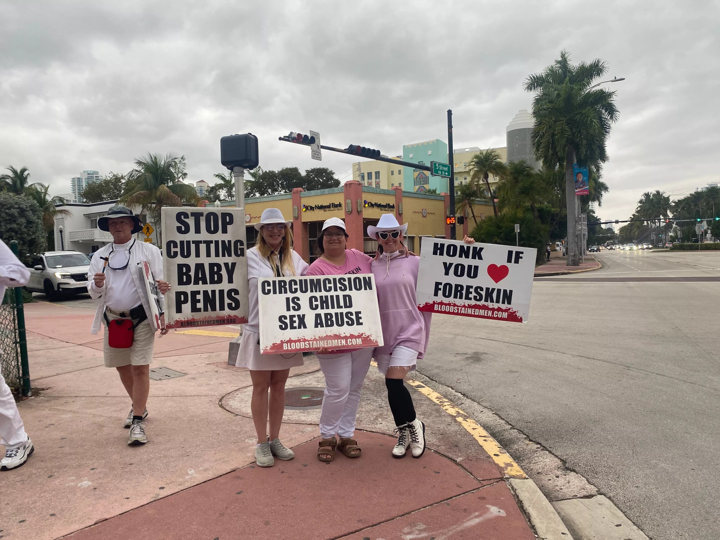 Bloodstained Men have organized 26 protests over two weeks across Florida. Earlier on Friday, they gathered at North Kendall Drive and 137th Avenue in Kendall and at SW Eighth Street and 107th Avenue near Florida International University’s Modesto Maidique campus. A day prior, they were in Key West and Marathon. Over the weekend, they’d move on to Pembroke Pines, Pompano Beach, Boynton Beach, and Jupiter, then on to Vero Beach, West Melbourne, Port Orange, Orange City, and Orlando. A billboard they purchased on northbound I-75 near Ocala reads, “Circumcision Cruel & Harmful.” The Bloodstained Men and their supporters in Miami Beach Photo by Jess Swanson