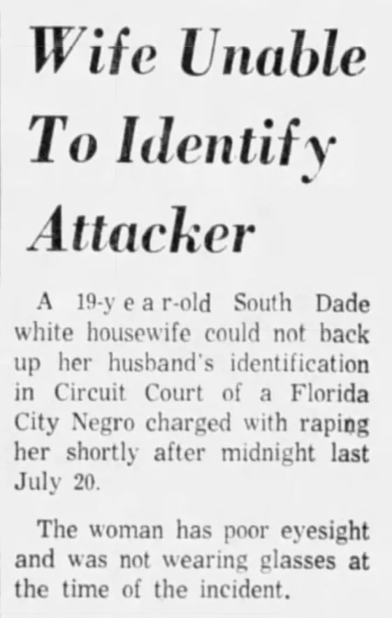 “A Florida City negro was sentenced to life in prison by Circuit Judge James W. Kehoe for the rape of a 19-year-old white South Dade housewife last July 19,” noted a brief item at the bottom of page 37 of the Miami News.