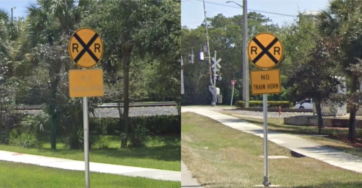 Unretouched Google Street View images of the “No Train Horn” sign at the Boca Raton railroad crossing from April 2022 (left) and February 2023 (right)
