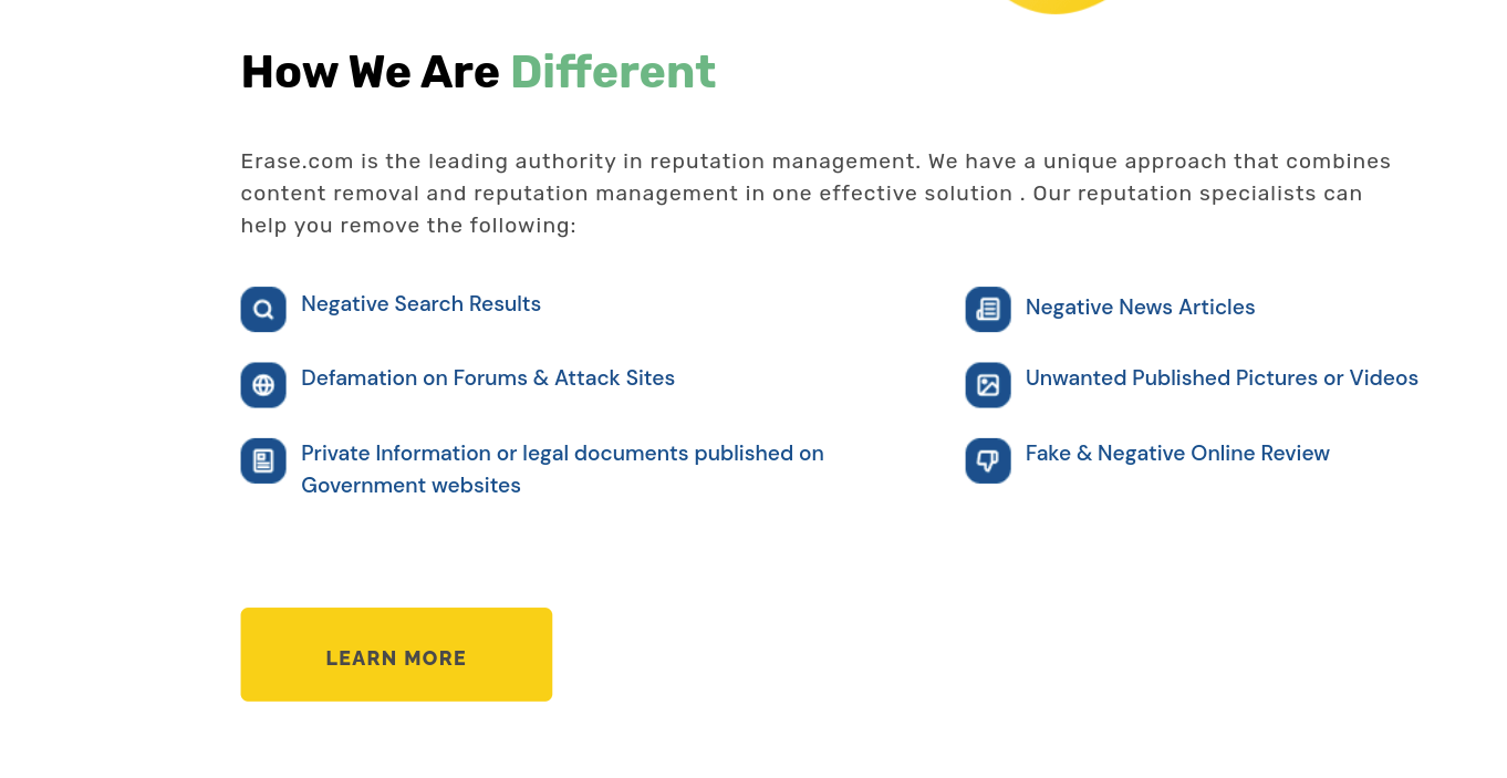 Erase.com offers to remove negative news articles, “fake and negative online reviews,” and Google search results. The service also offers “positive reputation management” and crisis-management solutions.