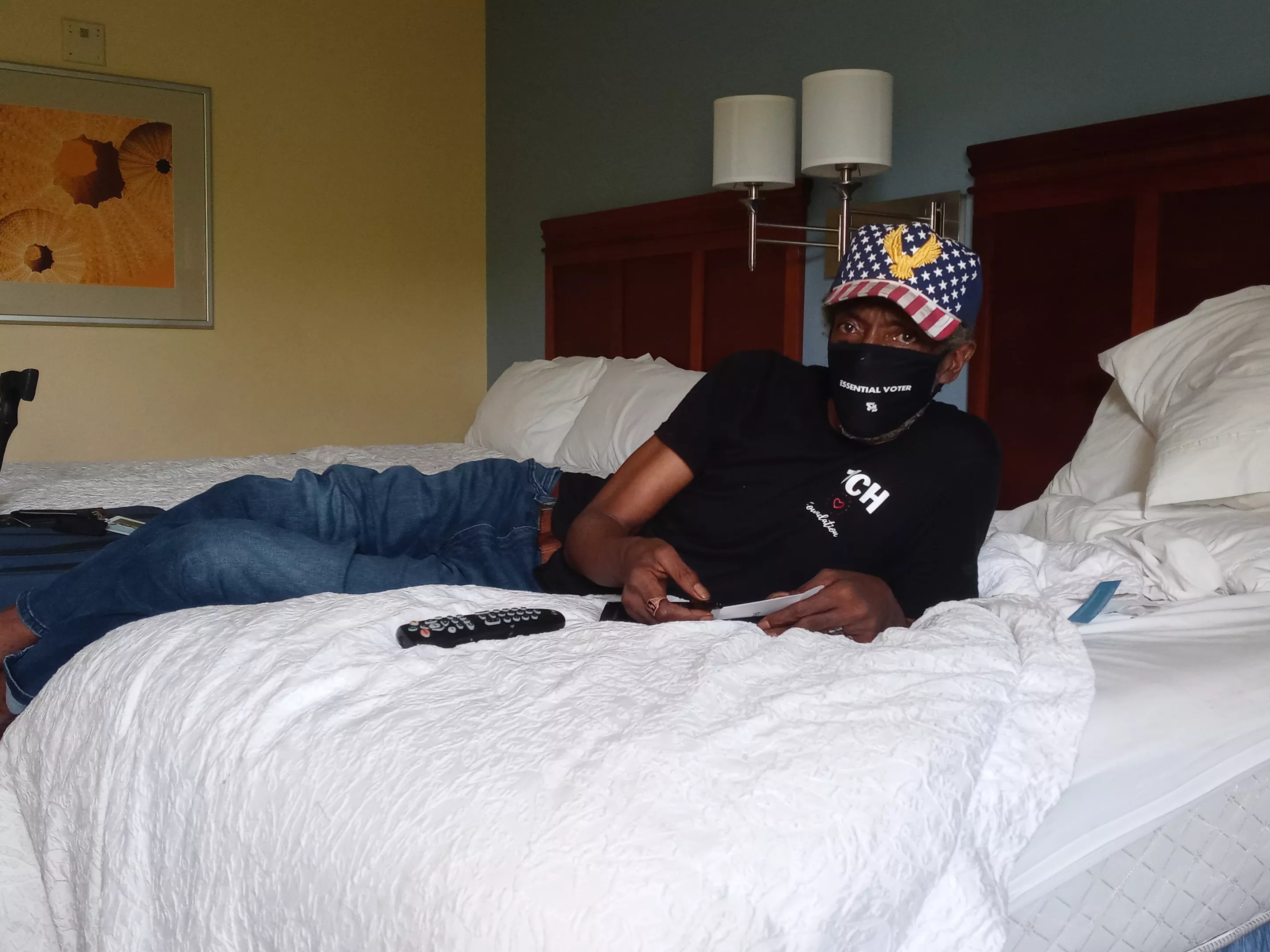 In a Doral hotel room, Michael Hamilton leans his cane against a mattress and clambers onto a bed to ease the pain in his legs. It’s been a chaotic week for the 70-year-old Liberty City resident, and all he wants is rest.