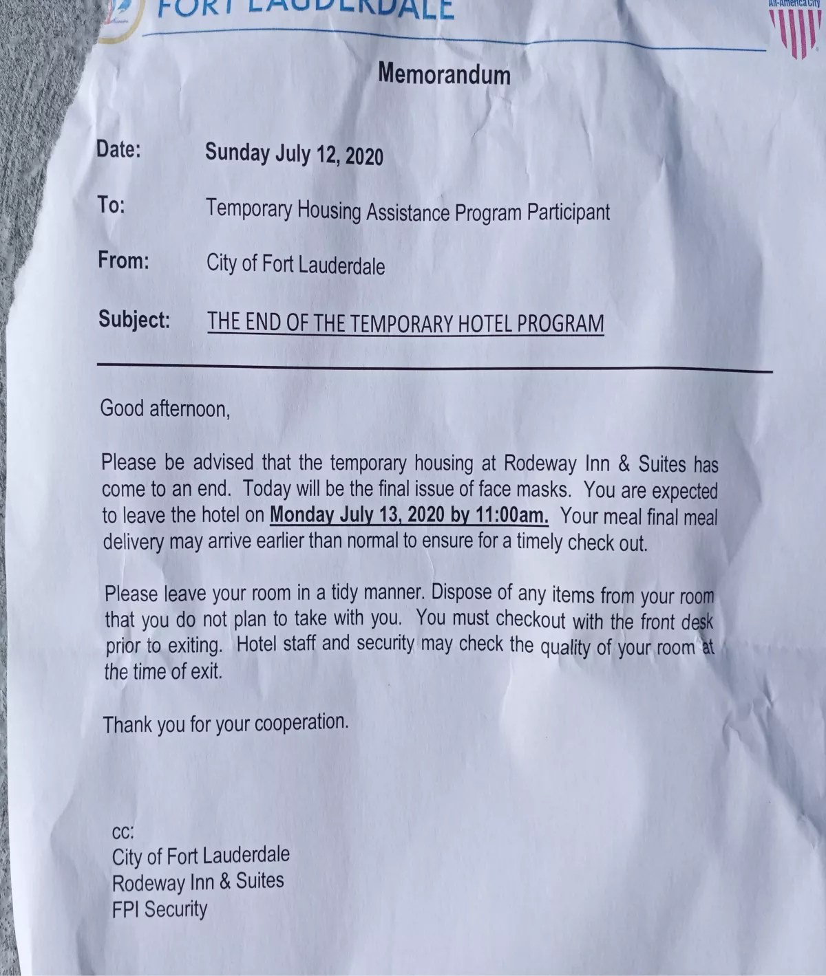 This past Sunday, the city issued a memorandum indicating that the program had expired and that everyone was required to check out the following morning. Hours later, however, Fort Lauderdale officials reversed course and, in a second memo distributed to residents, said they were permitted to stay for the time being, though it did not specify for how long.