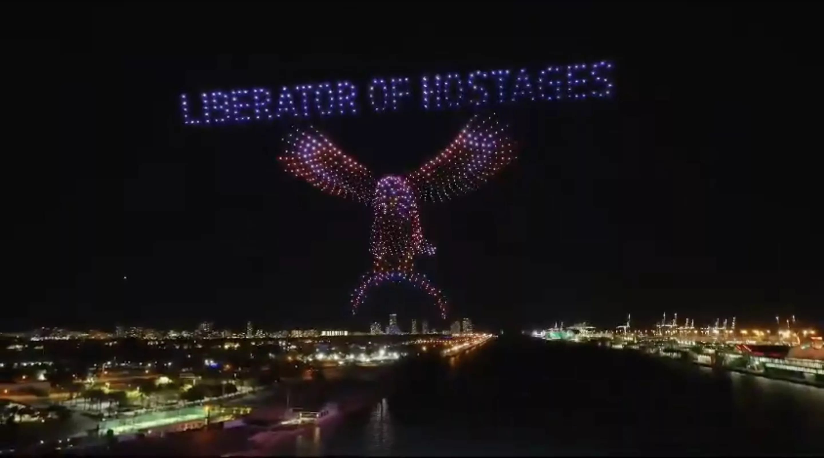 Then the formation morphed to outlines of the United States and Israel, heralded as “DEFENDERS OF FREEDOM” and “STRONGER TOGETHER.”