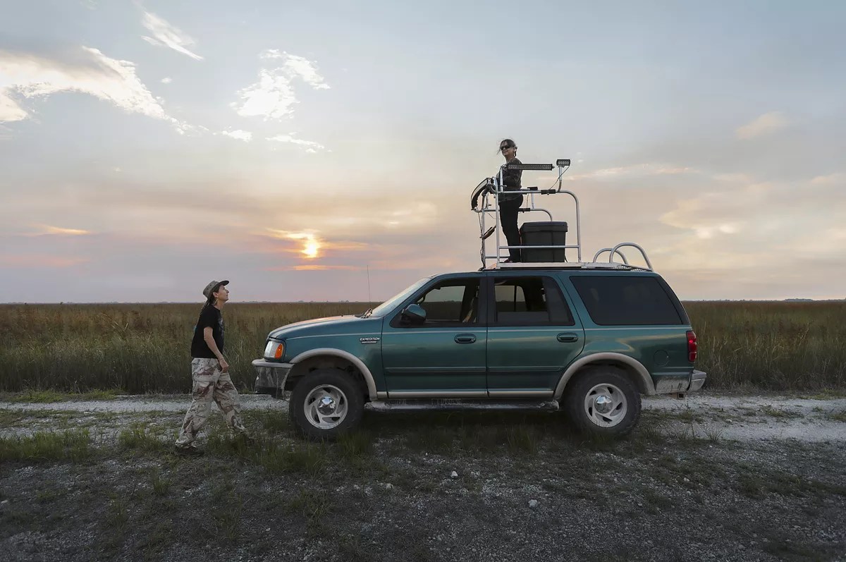Donna Kalil steers her forest-green 1998 Ford Expedition down a narrow path through the vast expanse of the Everglades. Leaning far outside the open window, she scans the tall grasses. On the roof, her best friend, Renee Yousefi, perches on a brightly lit platform modeled after a tuna tower and shines a flashlight on the slow-moving alligators lurking in the dark water.