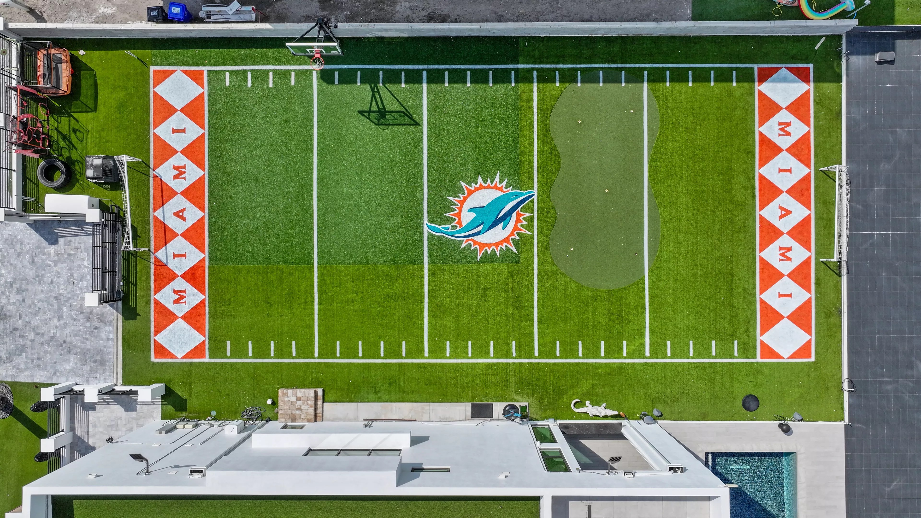 But this isn’t your run-of-the-mill modern waterfront mansion. This home has a custom Miami Dolphins football field in the neighboring coastal lot. The 30-yard field, which doubles as a putting green, features the Dolphins logo at the center and orange “Miami” endzones reminiscent of Hard Rock Stadium’s end zones.