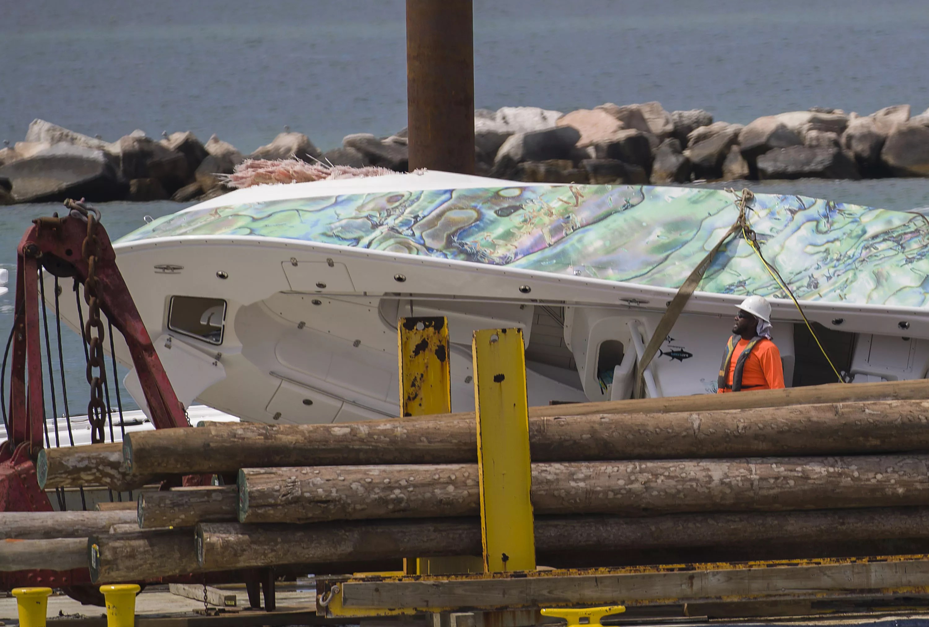A barge is used to carry a 32-foot center console boat that crashed into Government Cut’s north jetty, killing three people on April 22, 2019.