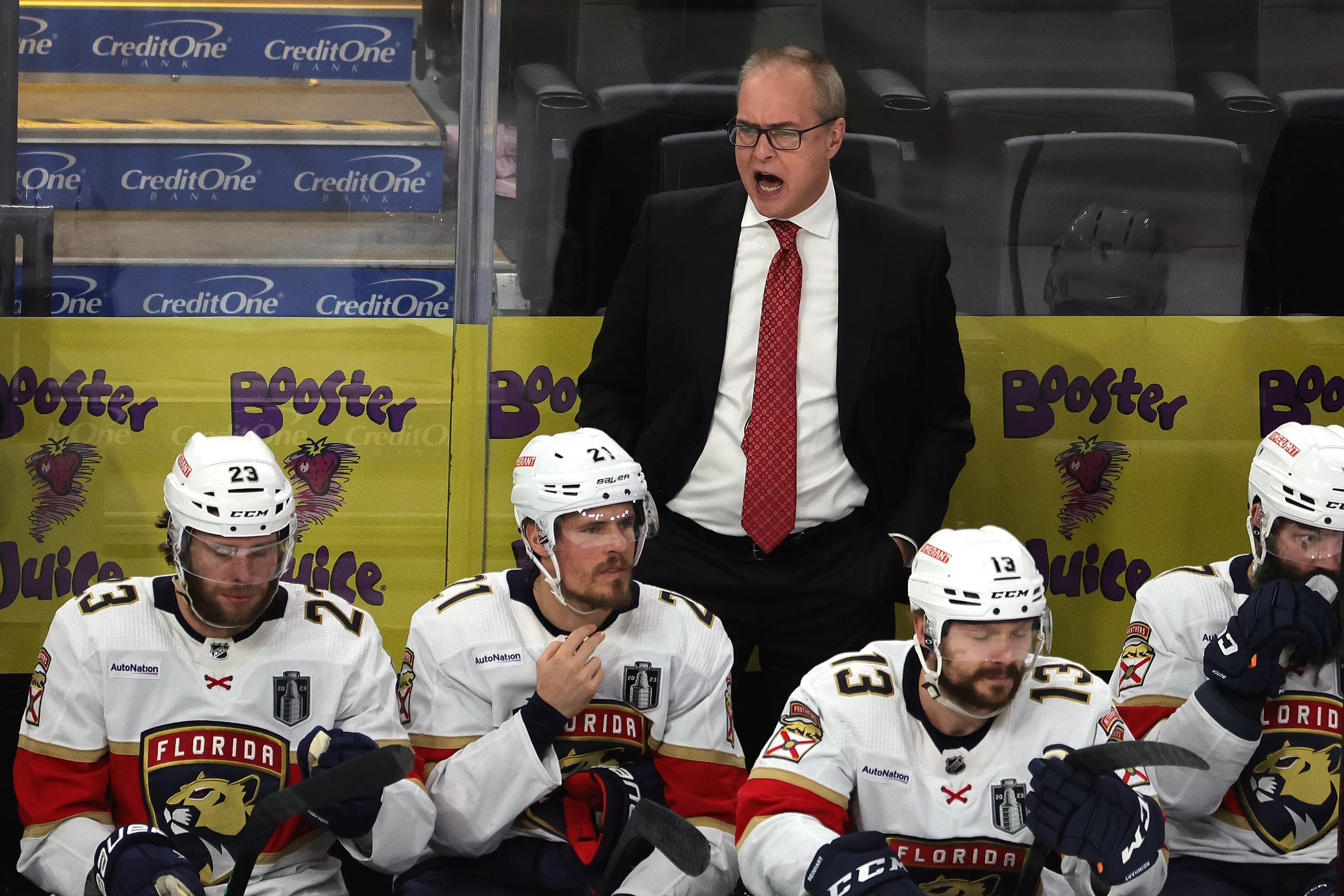 Head coach Paul Maurice of the Florida Panthers yells during the second period against the Vegas Golden Knights in Game Five of the 2023 NHL Stanley Cup Final at T-Mobile Arena on June 13, 2023.