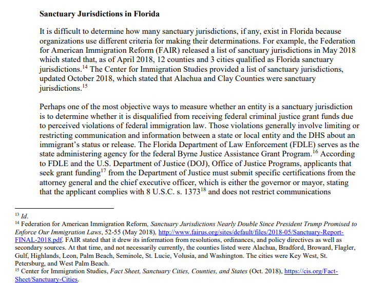 Amazingly, information from FAIR and another of FAIR’s sister organizations, the Center for Immigration Studies, also appeared in a staff analysis of the bill, which is publicly available online. According to the document, Gruters’ office used info from FAIR and the CIS to accuse multiple cities of still operating as “sanctuary” jurisdictions in Florida, even though none actually exist:
