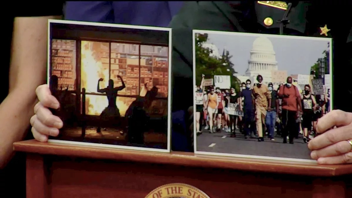 “Peaceful protest, we encourage,” he said, holding up a photo of protesters marching down Pennsylvania Avenue in front of the U.S. Capitol last June.
