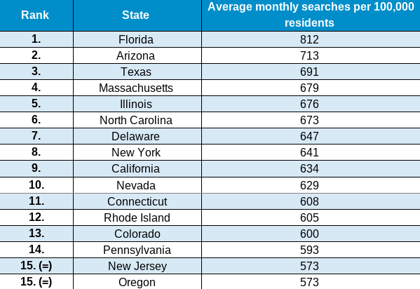 These are the 15 states search about addiction-related issues the most, with Flordia topping the list.