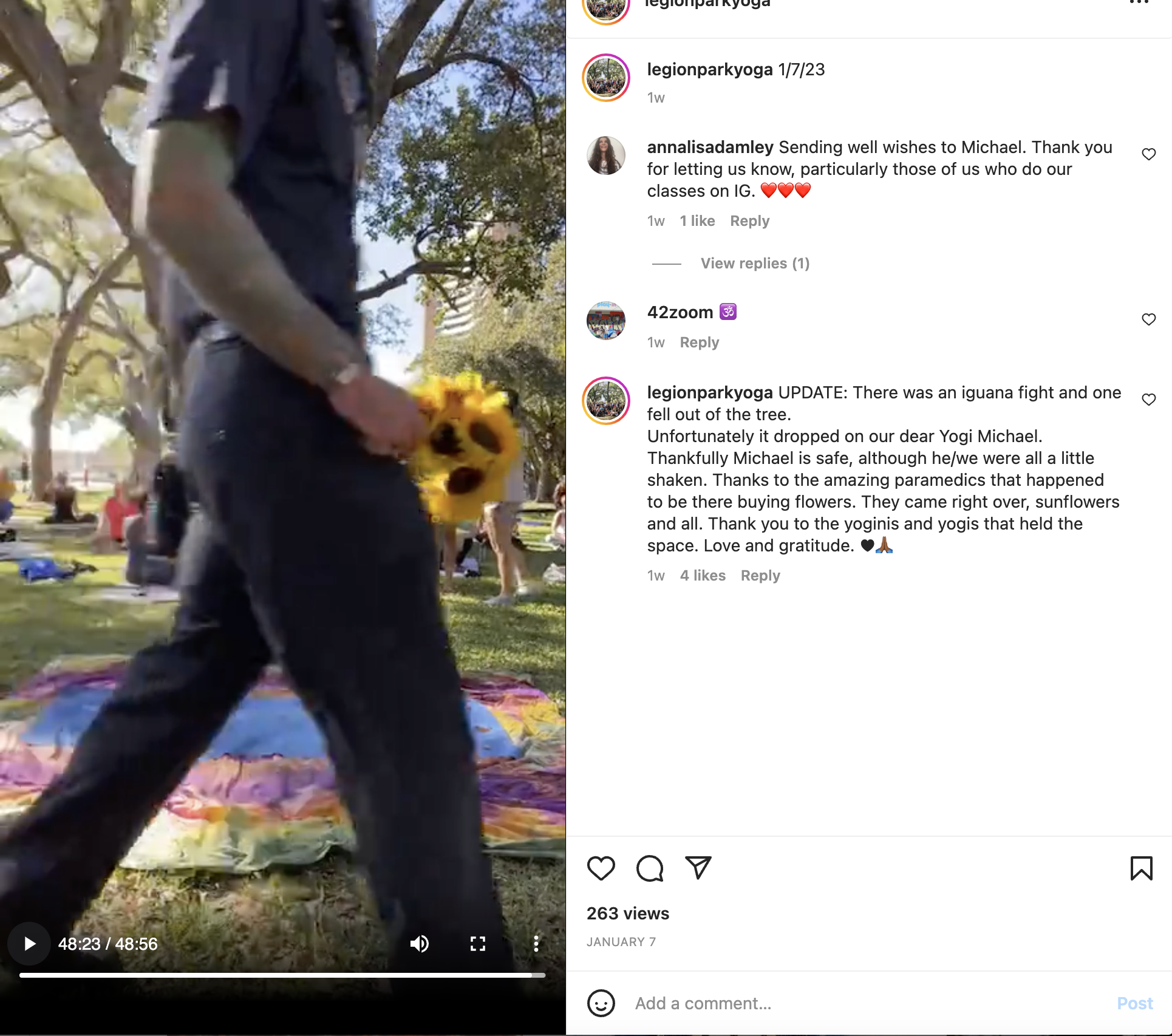 Nearby yogis who had their eyes open at the fateful moment would later inform Michael that his assailant was a green iguana weighing “between 20 and 30 pounds.” Though iguanas are locally and nationally famed for lapsing into temporary paralysis and falling from high places when ambient temperatures drop below 50 degrees Fahrenheit, witnesses reported that this particular specimen had been dueling with an even larger iguana on a branch roughly 25 feet off the ground.