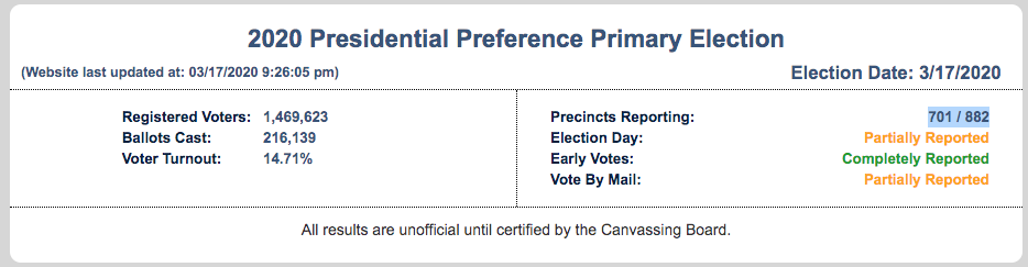 8:32 p.m.: Joe Biden continues to deliver a whooping against Bernie Sanders in Miami-Dade County, with about 35 percent of precincts reporting. Of 882 total precincts, 307 have reported 14,115 election-day votes for Biden and 4,557 for Sanders.