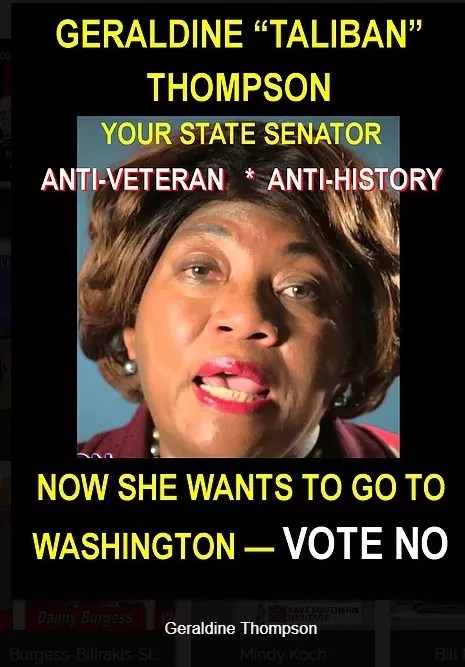 Geraldine “Taliban” Thompson because of her alleged “anti-veteran” and “anti-history” stances on Confederate regalia.