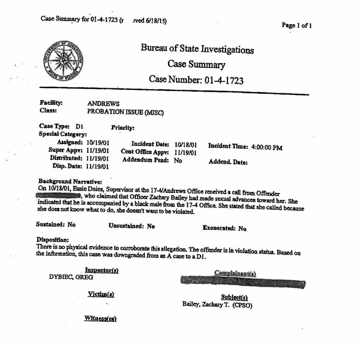 In one complaint from 2001, a female offender, whose name was redacted, alleged that Bailey had “made sexual advances toward her.” A Bureau of State Investigations Case Summary said the woman called in to report the incident, since she “does not know what to do, she doesn’t want to be violated.”