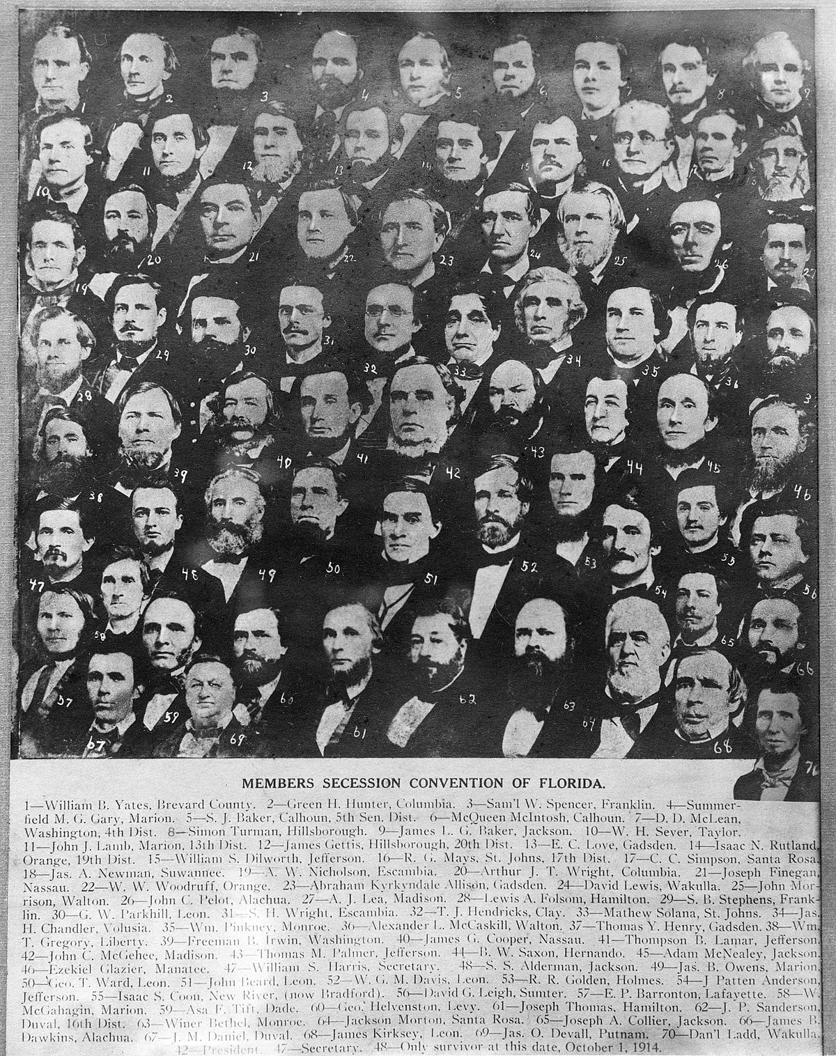 Today Florida has two designated National Underground Railroad Network to Freedom sites: Fort Jefferson in the Dry Tortugas and Bill Baggs Cape Florida State Park on Key Biscayne. The Cape Florida Lighthouse, built in 1825, is the oldest standing structure in Miami-Dade County. Its light provided safety to ships sailing around South Florida, but it also made it nearly impossible for slaves to escape undetected, cutting off a key meeting spot of Florida’s Underground Railroad. Members of the 1861 Tallahassee Secession Convention. See more photos of Florida’s black history here.