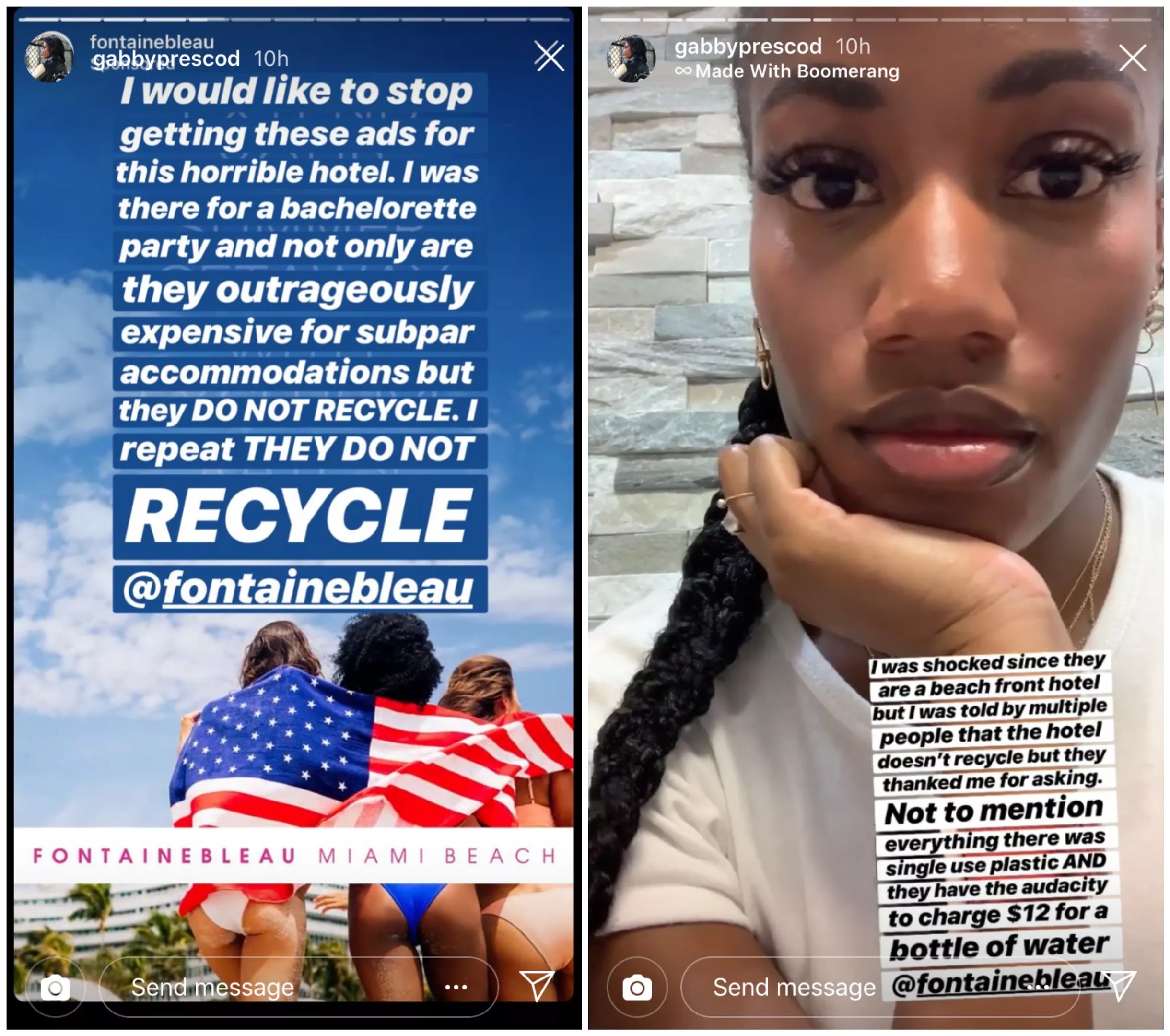 “I’m genuinely shocked that a beachfront property doesn’t recycle,” says Gabrielle Prescod, a fashion editor for Bustle who visited the Fontainebleau in May.