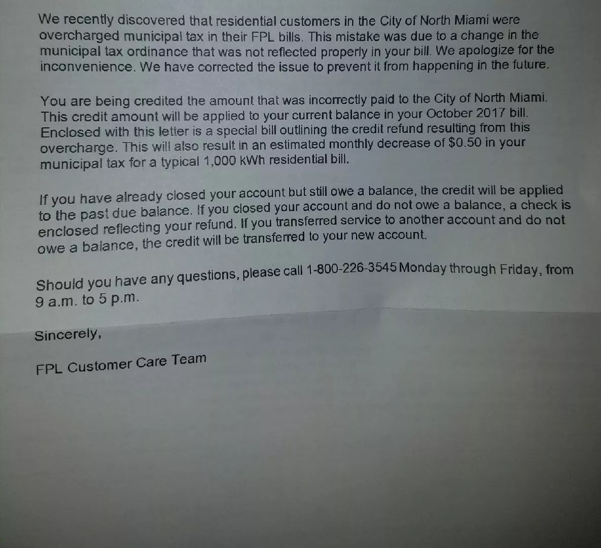 Customers who would rather have a refund than a credit to their accounts can call FPL at 800-226-3545 weekdays from 9 a.m. to 5 p.m. Customers who have closed their accounts or moved out of North Miami without opening another FPL account should also call to make sure their refund checks are sent to the correct address. Here’s a full copy of the letter sent to account holders: