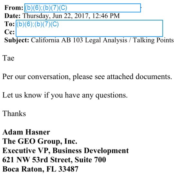 The remarkable part, however, is that GEO then passed its legal analysis to ICE. In the email dump, the government redacted most of the names of GEO employees in the file. However, one name was not removed: Adam Hasner, GEO’s executive vice president of business development.