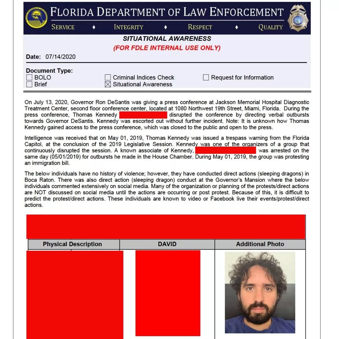Following the incident, Kennedy and Grant Stern, the executive editor of Occupy Democrats, obtained more than 80 pages of public records that showed FDLE had classified Kennedy as a “known agitator” and notified police about him ahead of the PortMiami press conference. Kennedy said the records also indicated that since July 2020, the department had been tracking his social media, address, car, and his so-called associates.