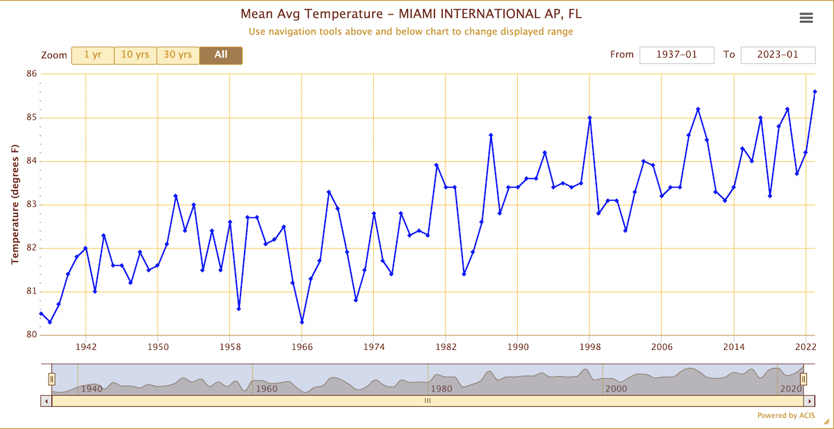 A graph shows summer average temperatures at Miami International Airport since 1942.