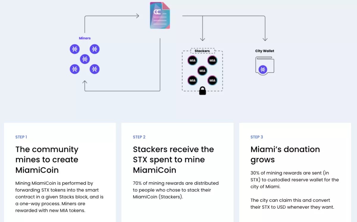 The simplest way to think of MiamiCoin, Bloomberg tells New Times, is by comparing it to a raffle in which you have no idea of the odds. CityCoin users commit Stack tokens for a chance to generate new MiamiCoin. When they do, 30 percent is automatically sent to the City of Miami’s digital wallet and, if users are successful, the remainder of the MiamiCoin they generate goes to them.