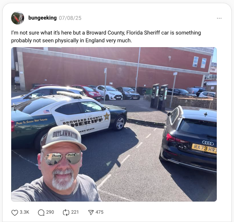 While sightseeing through England, Rodney Price posted a photo on the social media app Threads showing a Broward County Sheriff’s Office (BSO) cruiser.