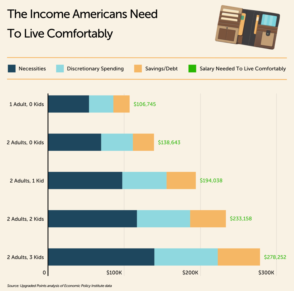 “Across the country, Americans are discovering that ‘living comfortably’ now carries a much higher price tag,” according to the study. “Essentials like rent, groceries, and child care have grown more expensive in nearly every region — and, in some cities, families need to earn well into six figures just to keep up with the basics.”