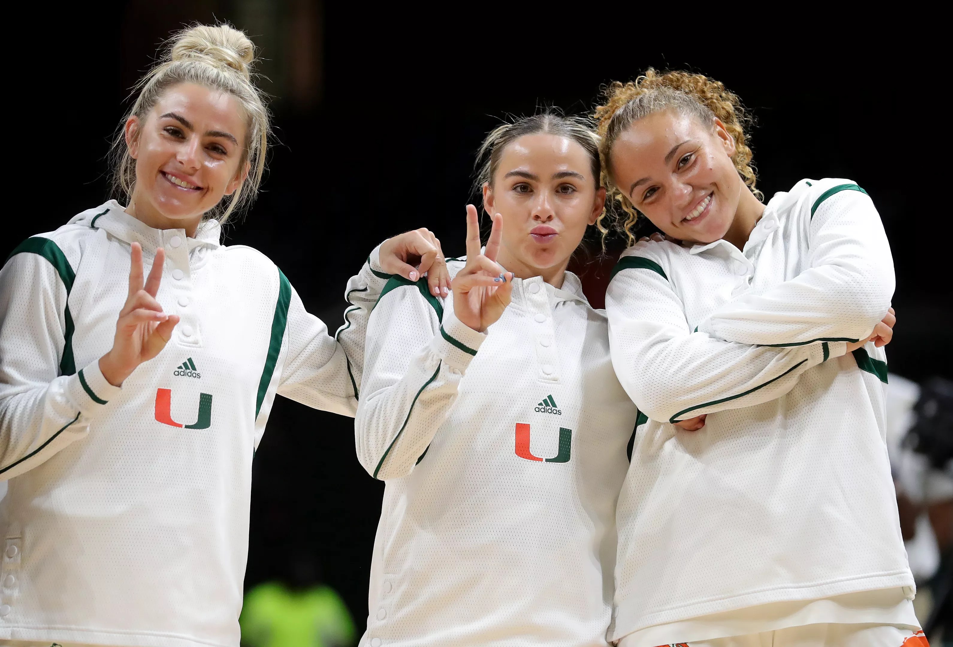 Miami Hurricanes players Haley and Hanna Cavinder alongside Kenza Salgues gear up for a game against the Florida Atlantic Owls on November 16, 2022 in Coral Gables.