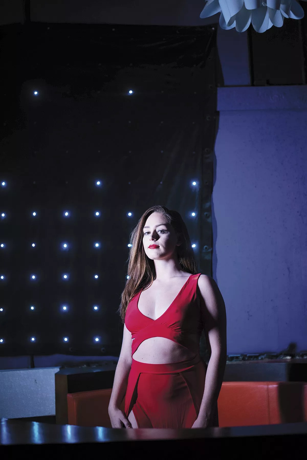 Back at home, she plans what to wear. Her go-to Footnight outfit is a long, cleavage-baring crimson dress with a slit from ankle to thigh on one side and straps that crisscross at her waist. Finally, it’s time for the finishing touch: a pair of sparkly silver open-toed pumps.