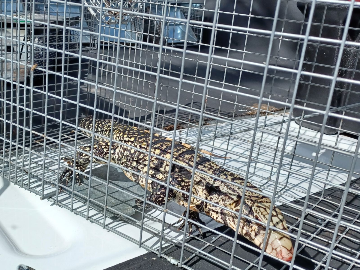 That looming threat is exactly why Everglades National Park created a tegu trapping program wherein park staff, alongside graduate researchers with the BioCorps Internship Program, go out into the park and along the perimeter to trap, retrieve, and study the critters before they can ravage the local ecosystem.