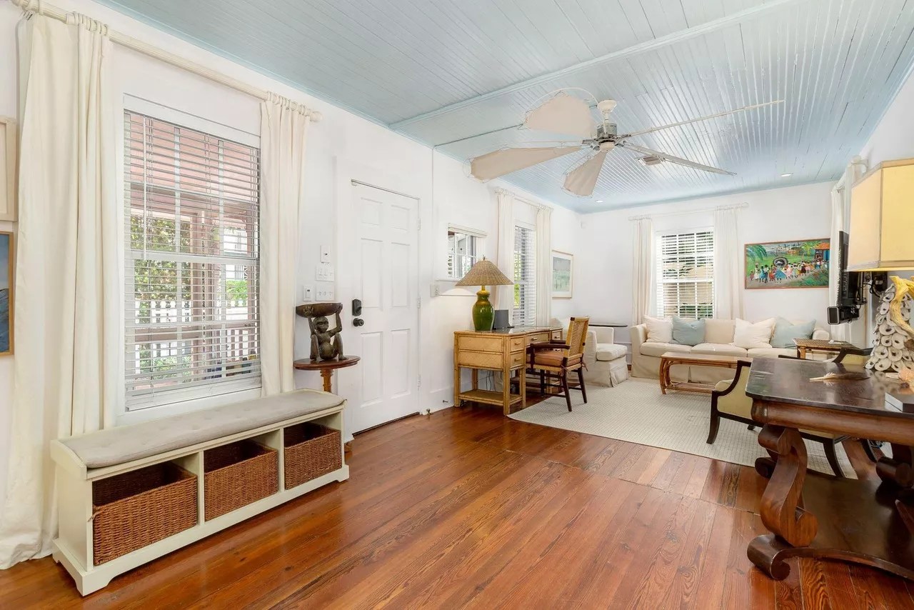 The 1925 Key West bungalow features two bedrooms and two bathrooms in the main house along with a detached recording studio and bathroom. The interior of the “one-of-a-kind piece of paradise” is adorned with Dade County pine floors. Redfin listing photo
