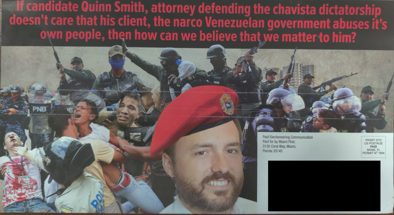 “Quinn Smith has his hands stained with blood from the dirty money that the Chavista dictatorship has paid him,” one mailer stated. “Candidate Quinn Smith has been hired as an attorney to defend the narcotrafficking Venezuelan dictatorship, while they murder, abuse and incarcerate thousands of young Venezuelans.”