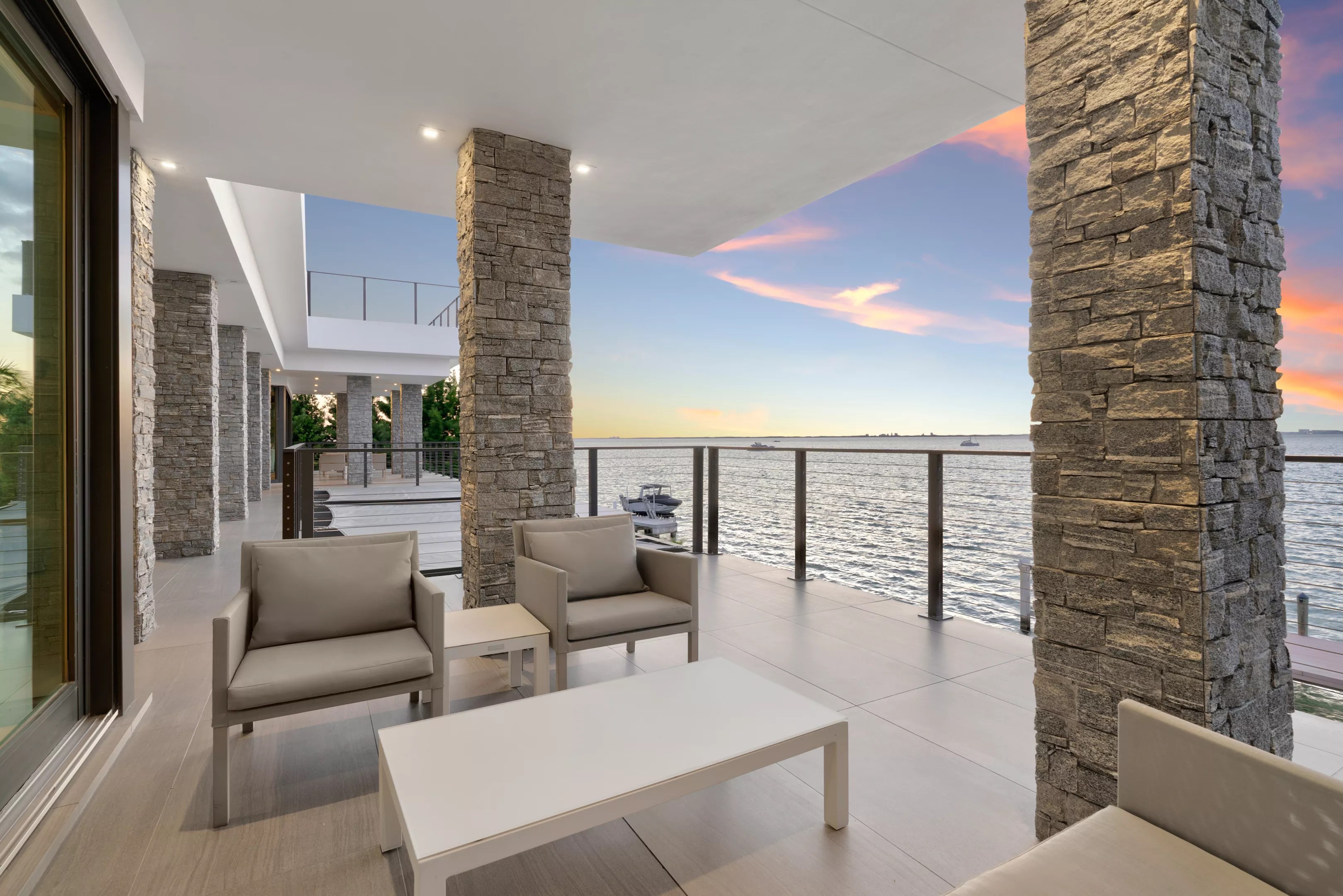 But we haven’t even gotten to the best part of the home: The outdoor area offers a double-level pool, a private dock, and a rooftop pickleball court.