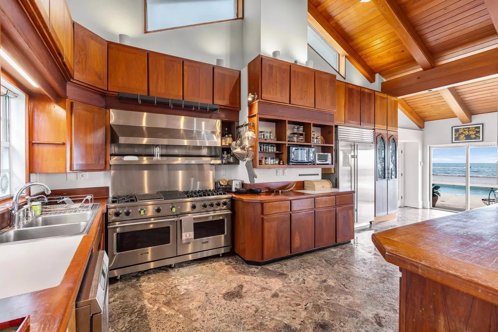 The 4,008-square-foot, five-bedroom, five-and-a-half-bathroom historic waterfront home at 400 South St. features unobstructed ocean views, wooden cathedral ceilings, sealed coral stone flooring, an elevator, restaurant-style stainless steel double Viking stove and ovens, a Sub-Zero fridge, a large wraparound balcony, pool, and a spacious lounging area.
