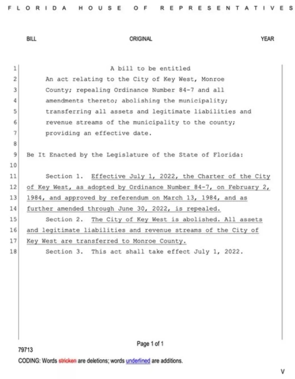 “The city of Key West is abolished,” the draft reads (New Times has included a screenshot of the draft at the end of the story). “All assets and legitimate liabilities and revenue streams of the City of Key West are transferred to Monroe County.”