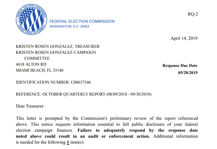 In its April letter, the FEC warned Rosen Gonzalez that she had not explained what had happened to 27 donations – totaling more than $43,000 – which she was supposed to have returned or redesignated within 60 days of losing her August 2018 primary election.