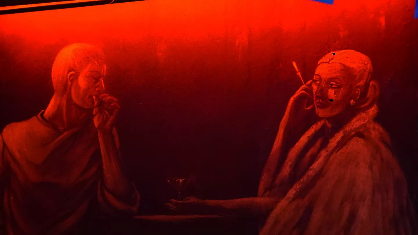 Look closely at the mural and you’ll note that the face of the elegantly coiffed woman is pockmarked with two small-caliber bullet holes.